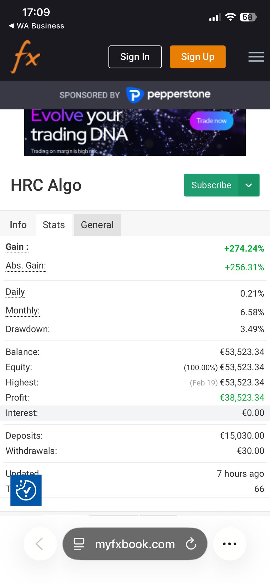 Controleer zelf alle trades, prestaties en risicoregels via onze gekoppelde MyFXBook omgeving.